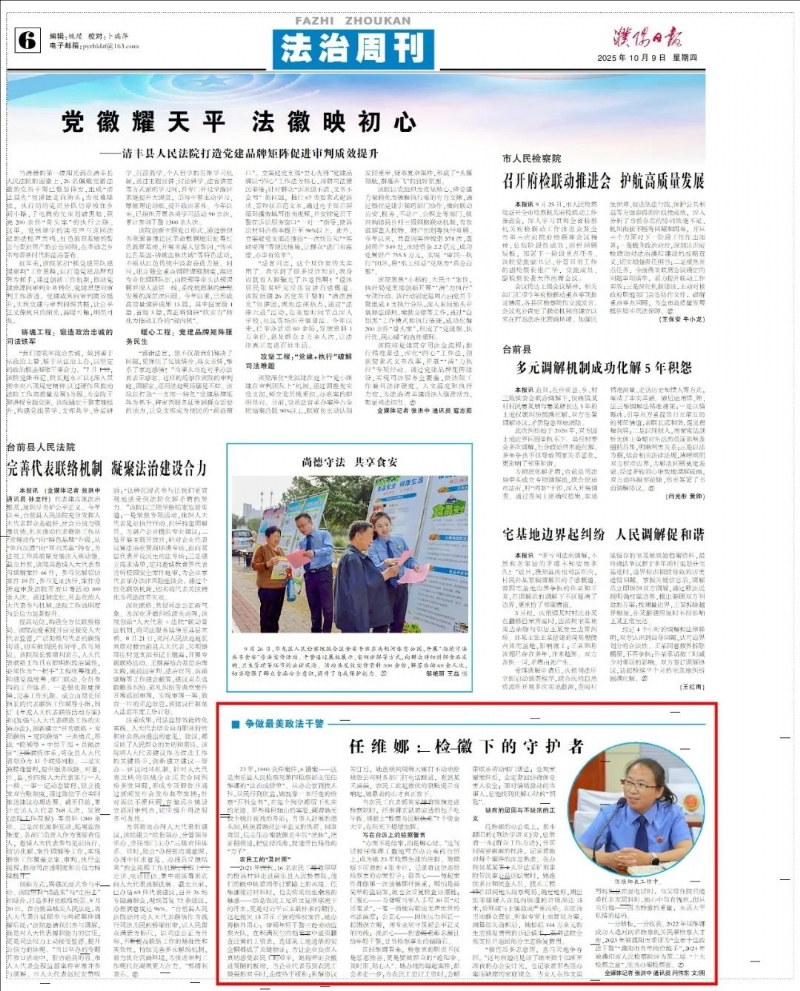 一分耕耘,一分收获。2022年任维娜成功入选河南省检察机关民事检察人才库,2023年被濮阳市委评为“全市十佳政法干警”“濮阳市青年岗位能手”,2024年被濮阳市人民检察院评为第二届“十大检察之星”、优秀办案检察官。